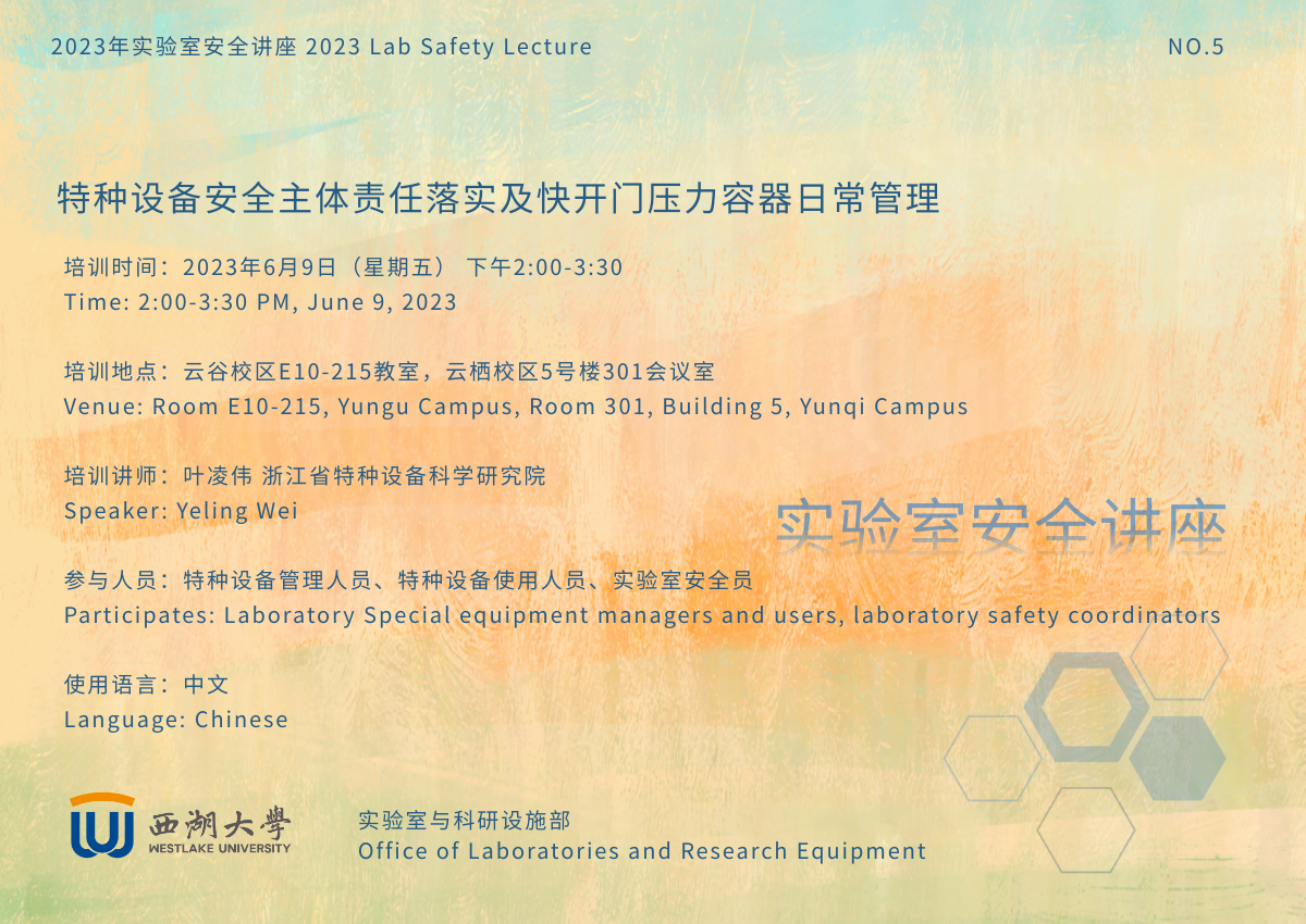 为强化实验室特种设备安全主体责任意识,提高实验室特种设备安全使用管理水平,交流和分享相关经验,实验室与科研设施部邀请浙江省特种设备科学研究院高级工程师叶凌伟来我校开展专题讲座,请各单位组织相关人员参与本场讲座!