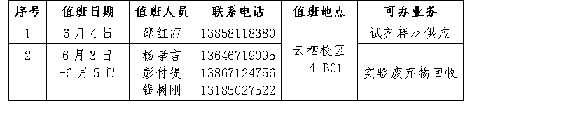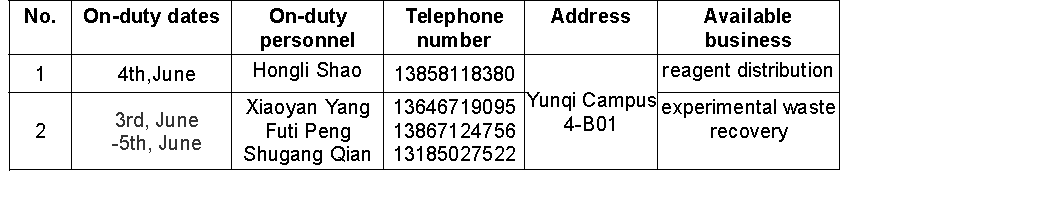 Reagent suppliers may suspend the delivery of hazardous chemicals during the holidays, please prepare well in advance. Chemical reagents distribution and recovery of experimental waste will operate normally on the duty days.