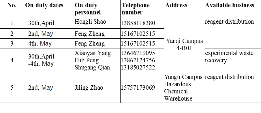 2.Safety reminders:Reagent suppliers may suspend the delivery of hazardous chemicals during the holidays, please prepare well in advance. Chemical reagents distribution and recovery of experimental waste will operate normally on the duty days.